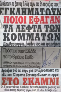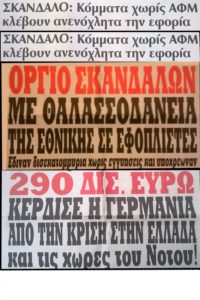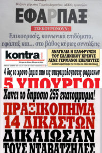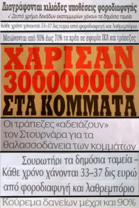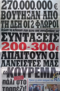 Παράλληλα όμως χαρίζουν εκατομμύρια και δις σε κάποιους. Όπως 200 εκατομ. στο ΔΟΛ του Ψυχάρη, 250.000 € στις τράπεζες του Σαββίδη παλαιότερα, και σε πολλούς, πάμπολλους άλλους. Δείτε παρακάτω τα Πρωτοσέλιδα των εφημερίδων.