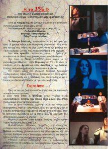 Συγκλονιστική ήταν η θεατρική παράσταση ʺτο 3 %ʺ στο μικρό θεατράκι Ειλισσός στην περιοχή Νέος Κόσμος της Αθήνας. Για το έργο έχουμε ξαναγράψει σε αυτό το Site, αλλά το κείμενο της Βίλης Σωτηροπούλου η οποία και πρωταγωνιστεί είναι τόσο συγκλονιστικό, που προτείνουμε σε όλους τους φίλους να σπεύσουν να το δουν, όσο συνεχίζονται ακόμα οι παραστάσεις. Η ιστορία εκτυλίσσεται το 2040 σε μια πατρίδα ανελεύθερη, με φυλακισμένους στα σπίτια τους λόγω του αδιαχώρητου των φυλακών και με Χαφιέδες, Φύλακες ή Κατηχητές παντού. Με εικόνες ενός κράτους όπου η απάτη στα πάντα και η τιμωρία για το τίποτα είναι καθημερινότητα. Το έργο κάνει τους νέους – που και στο έργο οδηγούνται για καριέρα στο εξωτερικό – να προβληματιστούν για τα μέλλοντα και θυμίζει στους μεγαλύτερους, ότι παρόμοιες συνθήκες υπήρξαν στην Γερμανία του Χίτλερ, ενώ αναβιώνουν και πάλι σιγά – σιγά. Τελικά, σε αντίθεση με όσα βιώνουμε, σήμερα ή στο 3ο Ράϊχ, μια αντίδραση αρχίζει να φαίνεται στον ορίζοντα εκείνου του φανταστικού κράτους, η οποία ανακουφίζει λίγο τον θεατή, αν και τελικά μένει μια μεγάλη ανησυχία για το τι μας περιμένει.