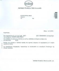 * Την Παραμονή Χριστουγέννων ακριβώς, μου έρχεται μια δεύτερη επιστολή από την Εθνική (Εχθρική θα έλεγα) Τράπεζα και μου ανακοινώνουν ότι κατασχέθηκε από τον λογαριασμό των καταθέσεών που έχω σε αυτήν (που να μην είχα κάνει το λάθος να διατηρώ) το ποσόν των 89,93 € υπέρ του Δήμου Κομοτηνής.