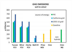 Επιπλέον και επειδή τα χρησιμοποιούμενα στην πράξη ενεργειακά στοιχεία υδρογόνου λειτουργούν με βαθμό απόδοσης περίπου 50%, τελικώς μόνο το 25% της ενέργειας που απαιτήθηκε για την παραγωγή του υδρογόνου καταλήγει να αξιοποιείται από την προωστήρια μονάδα του αυτοκινήτου. Αυτή η κατά 25% αποδοτικότητα δεν μπορεί βέβαια να συγκριθεί με την αντίστοιχη των ηλεκτρικών αυτοκινήτων με συσσωρευτές που πλησιάζει ή και υπερβαίνει το 80%. Το αποτέλεσμα είναι ότι το Honda Clarity Fuel Cell καταναλώνει σχεδόν την τριπλάσια ενέργεια εκείνης που καταναλώνει, για παράδειγμα, ένα Chevrolet Bolt EV. Επίσης τo Honda Clarity Fuel Cell φαίνεται να καταναλώνει περίπου την ίδια ποσότητα ενέργειας με εκείνη του ήδη αποσυρθέντος από την αγορά μη υβριδικού Honda Civic Natural Gas, Επομένως η ιδέα ότι οι μελλοντικές μεταφορές θα στηρίζονται στην ευρεία χρήση του υδρογόνου και των ενεργειακών στοιχείων ακόμα και εάν στο μέλλον το σύνολο της παραγωγής του υδρογόνου γινόταν με τη χρήση ανανεώσιμων πηγών ενέργειας, καθίσταται παντελώς ανεδαφική αφού ακόμα και σε εκείνη τη θεωρητική εκδοχή θα απαιτούσε τουλάχιστο τον διπλασιασμό του υπάρχοντος δυναμικού ηλεκτροπαραγωγής.