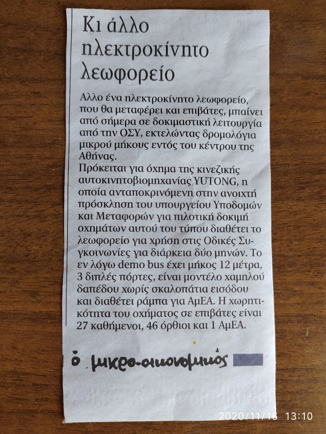 Κι ενώ γίνονται τεράστιες προσπάθειες σήμερα από τους ξένους, εμείς ακόμα στον κόσμο μας ! Ένα παράδειγμα το ηλεκτροκίνητο λεωφορείο, που μας διέθεσε για δοκιμές δύο μηνών η κινέζικη αυτοκινητοβιομηχανία YUTONG. Το παρέλαβε λοιπόν ο ΟΣΥ και το έχει δοκιμαστικά σε δρομολόγια μικρού μήκους (γιατί άραγε 😉 εντός του κέντρου της Αθήνας. Και μετά τι ; Κανείς δεν ξέρει. Ενώ είναι προφανείς οι πολλές δυνατότητες που μας προσφέρονται. Όπως το να αγοράσουμε έναν αριθμό από αυτά για να βελτιώσουμε το συγκοινωνιακό της Αθήνας, το να οργανώσουμε την συναρμολόγησή ή την κατασκευή τους εδώ ή ακόμα καλύτερα, το να κατασκευάσουμε εδώ δικής μας επινόησης. Είχαμε την υποδομή στη Σκύδρα. Τι την κάναμε αυτή την σημαντική υποδομή ; Ποιος να ξέρει, όταν σε όλα είμαστε υπoτελείς άλλων.
