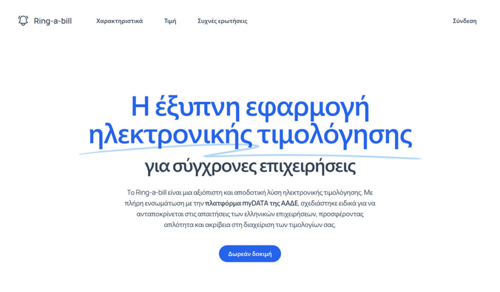 Η εφαρμογή Ring-a-bill είναι μια σύγχρονη πλατφόρμα τιμολόγησης που έχει σχεδιαστεί ειδικά για τις ανάγκες των ελληνικών επιχειρήσεων. Η εφαρμογή Ring-a-bill επιτρέπει την απρόσκοπτη ενσωμάτωση με την πλατφόρμα myDATA της ΑΑΔΕ, προσφέροντας μια απλή και αποτελεσματική λύση για την έκδοση και διαχείριση των ηλεκτρονικών τιμολογίων.